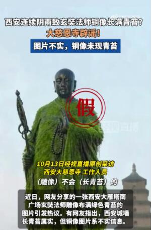 近日,有网民发文称,西安连续下雨导致城墙长了青苔,并附了一张大雁塔南广场玄奘法师雕塑也布满绿色青苔的图片,引发网络热议。有网民指出,城墙长青苔属实,但玄奘法师像的图片疑为不实信息。 10月13日,@经视直播 记者向西安大慈恩寺进行求证。寺内工作人员辟谣称,位于大雁塔南广场的玄奘法师铜像并未出现青苔生长情况,尽管西安...