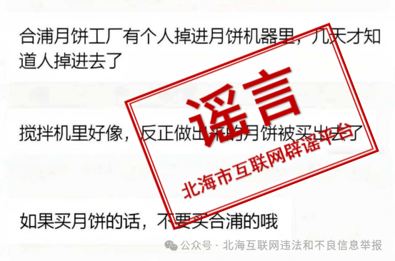 近日,网络上流传“合浦某月饼厂工人掉进机器,几天后才被发现”“做出来的月饼被卖出去了”等信息,经调查,相关传言纯属谣言,严重误导公众,造成极其不良的社会影响。