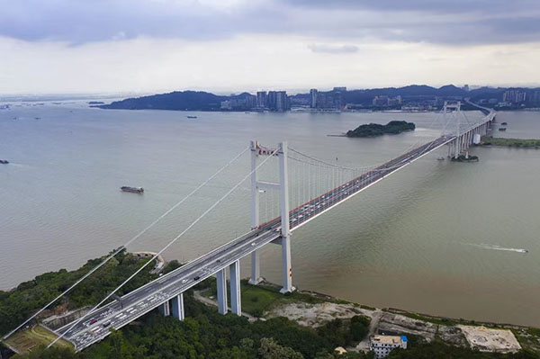 虎门大桥位于珠江口狮子洋上,连接广州市南沙区和东莞市虎门镇,全长约16公里,双向6车道。主桥长4.6公里,主跨为888米的钢箱梁悬索桥。   业内人士表示,虎门大桥主桥是我国自主设计建造的第一座大跨度钢箱梁悬索桥,是当时规模最大的公路现代悬索桥,在中国桥梁建造史上有诸多技术创新。