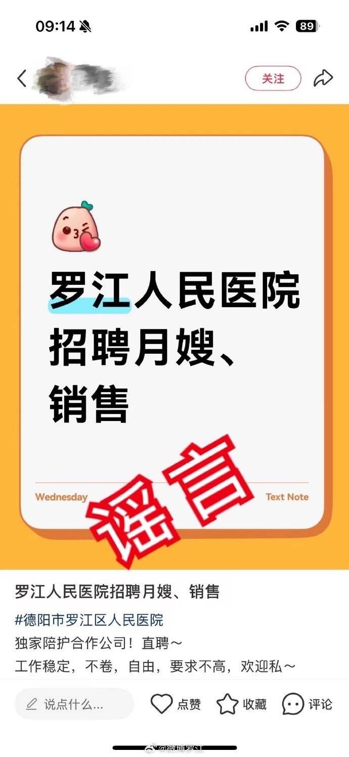 10月29日,小红书用户发布贴文称,“罗江人民医院招聘月嫂、销售”。