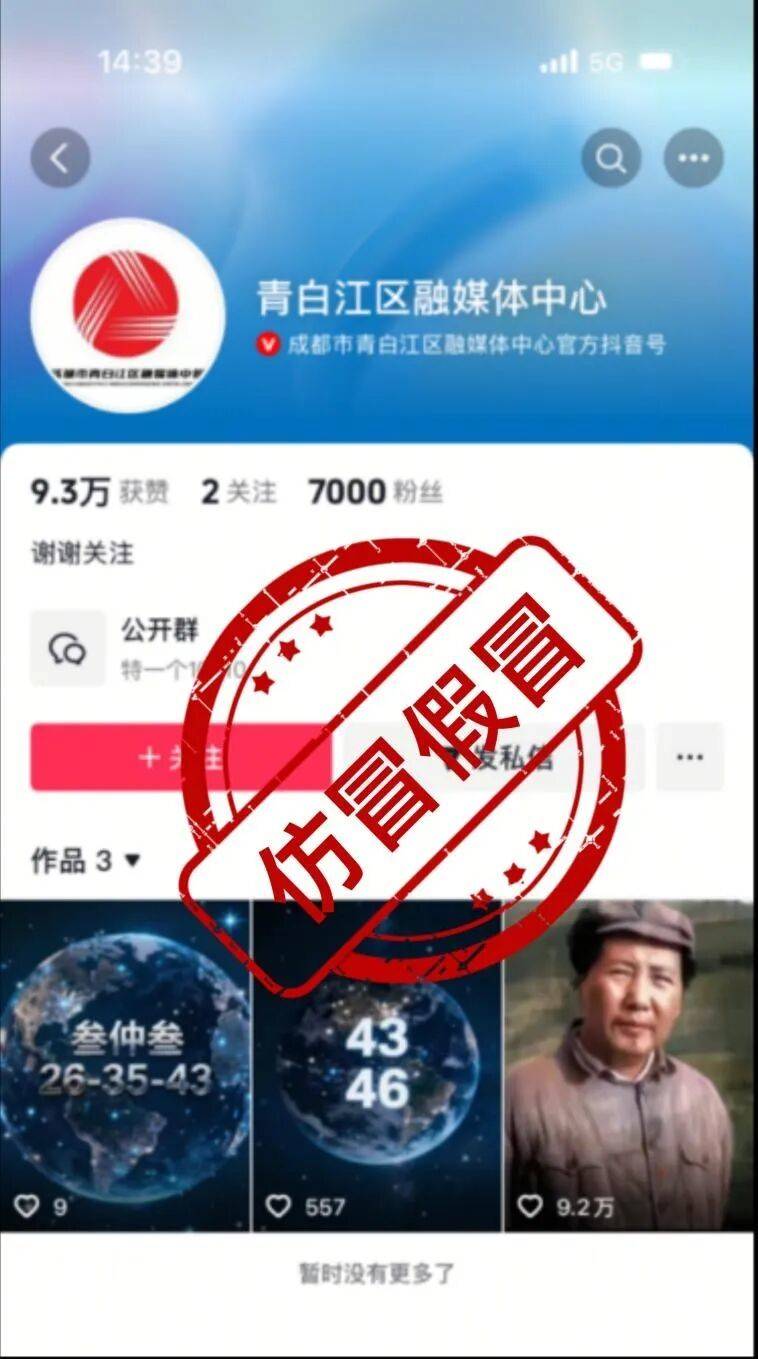 典型案例四:青白江区网信部门巡查发现抖音平台出现冒充官方名义注册的“青白江区融媒体中心“账号,违规发布虚假不良信息,严重误导公众、损害官方公信力。青白江区网信部门及时指导青白江区融媒体中心完善证据材料,通过“平台举报+客服跟进+12377举报”开展仿冒假冒账号处置工作。目前相关违规内容已全部删除,假冒账号被封禁。