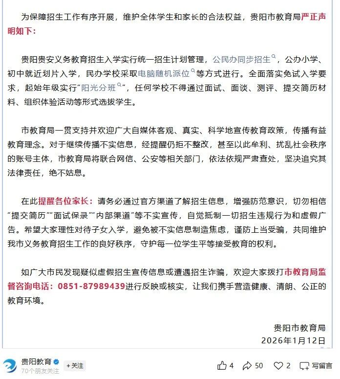 对此,贵阳市教育局严正声明:以上内容为不实信息,其本质是以牟取不当利益为目的,蓄意散布虚假言论。此类行为严重扰乱我市义务教育招生秩序,破坏教育公平,误导广大家长和学生,造成不良社会影响。