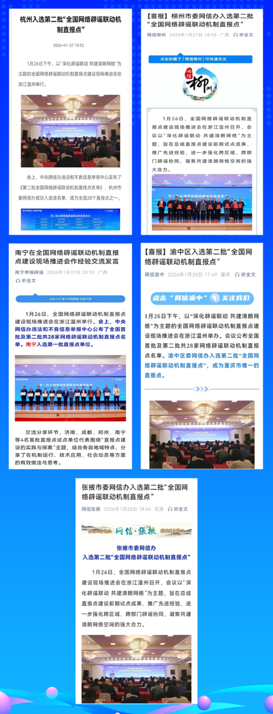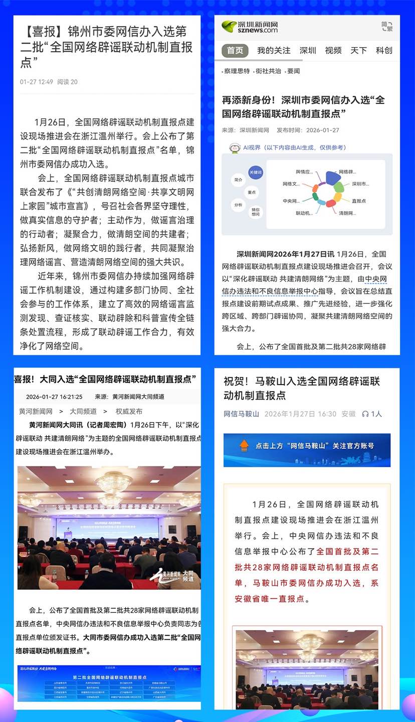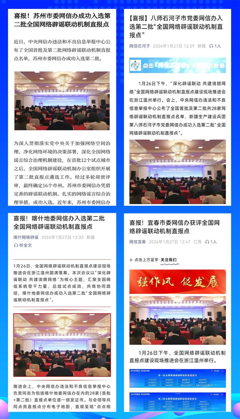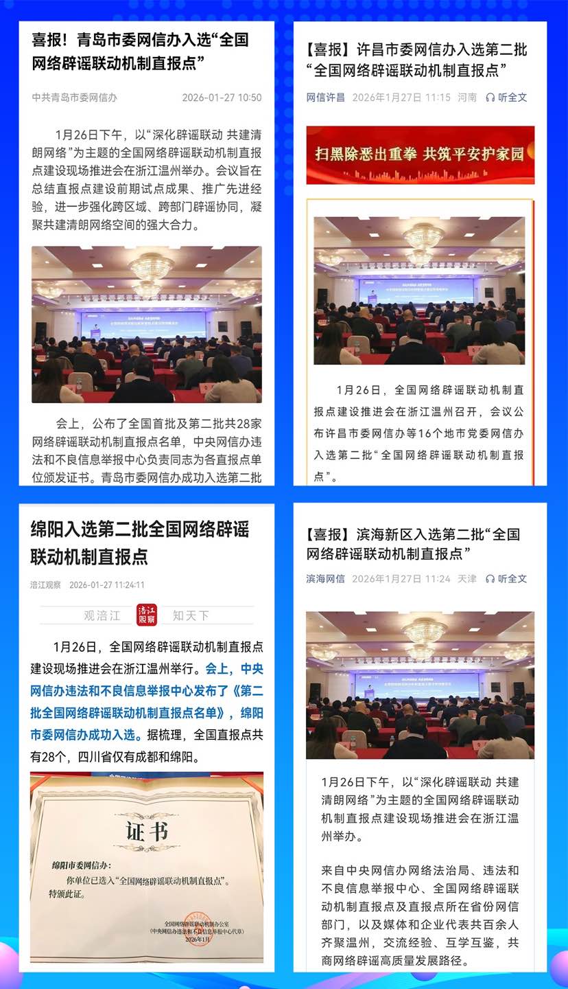 1月26日至27日,全国网络辟谣联动机制直报点建设现场推进活动在浙江温州举行。活动公布了全国首批和第二批共28家直报点名单,这些直报点单位将与中央网信办举报中心建立更快捷的线索通报、协同查证、联动辟谣等工作机制,快速应对谣言,化解风险,提升城市形象,这可是实实在在的好事。