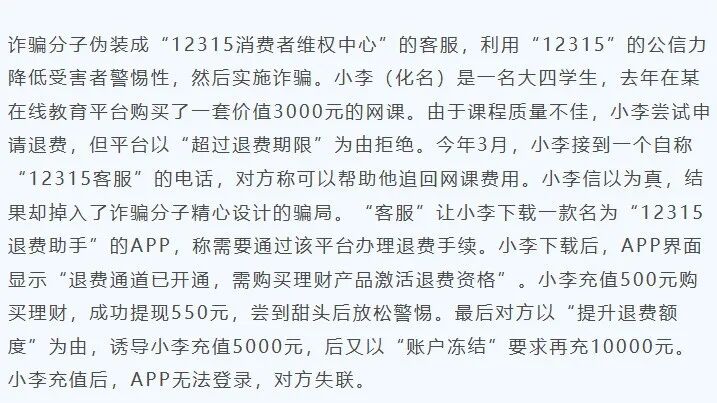 虚假退费诈骗披着“全国12315平台”“市场监管局”等权威外衣,引导通过二维码、网址链接、安装包等方式下载安装可疑APP,窃取银行卡、密码、验证码、生物识别等信息,需要警惕充值、解冻、提速等诈骗信号;防范此类诈骗的关键在于构建“官方核实—信息保护—冷静操作”的三道防线。任何涉及退费的通知,都应通过机构官网、官方APP等原始渠道交叉验证,切勿轻信陌生短信或私人社交账号的信息。