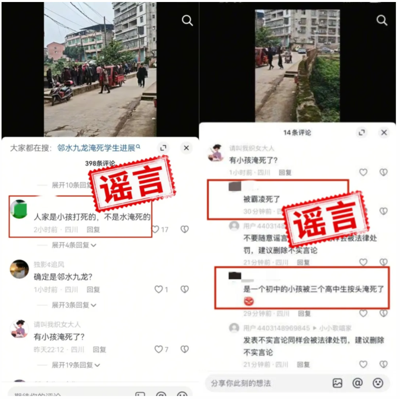 2025年12月,邻水一未成年人彭某强在河边玩耍时意外失足溺亡。事发后,刘某雁、何某辉、孔某等人在未经证实的情况下,通过网络平台编造发布“死者被人掐死”“死者生前遭受校园霸凌”“被高中生按头在水里淹死”等不实信息,造成恶劣社会影响。广安公安机关已依法对刘某雁、何某辉、孔某等人处以行政处罚。
